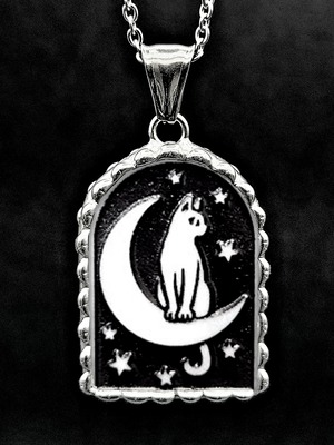 【検索用タグ】 白猫, 猫, ネコ, Black Cat, 夜景, 星, 三日月, 窓, ネックレス, ペンダント, 白, ホワイト, 黒, ブラック, B&W, ガラス, クリア, シルバー, 銀, 一点物, ハンドメイド, ギフト, 贈り物, お祝い, プレゼント, 幻想, ファンタジー, シュール, 作家:若林真耶(マヤズワークス、mayasworks)