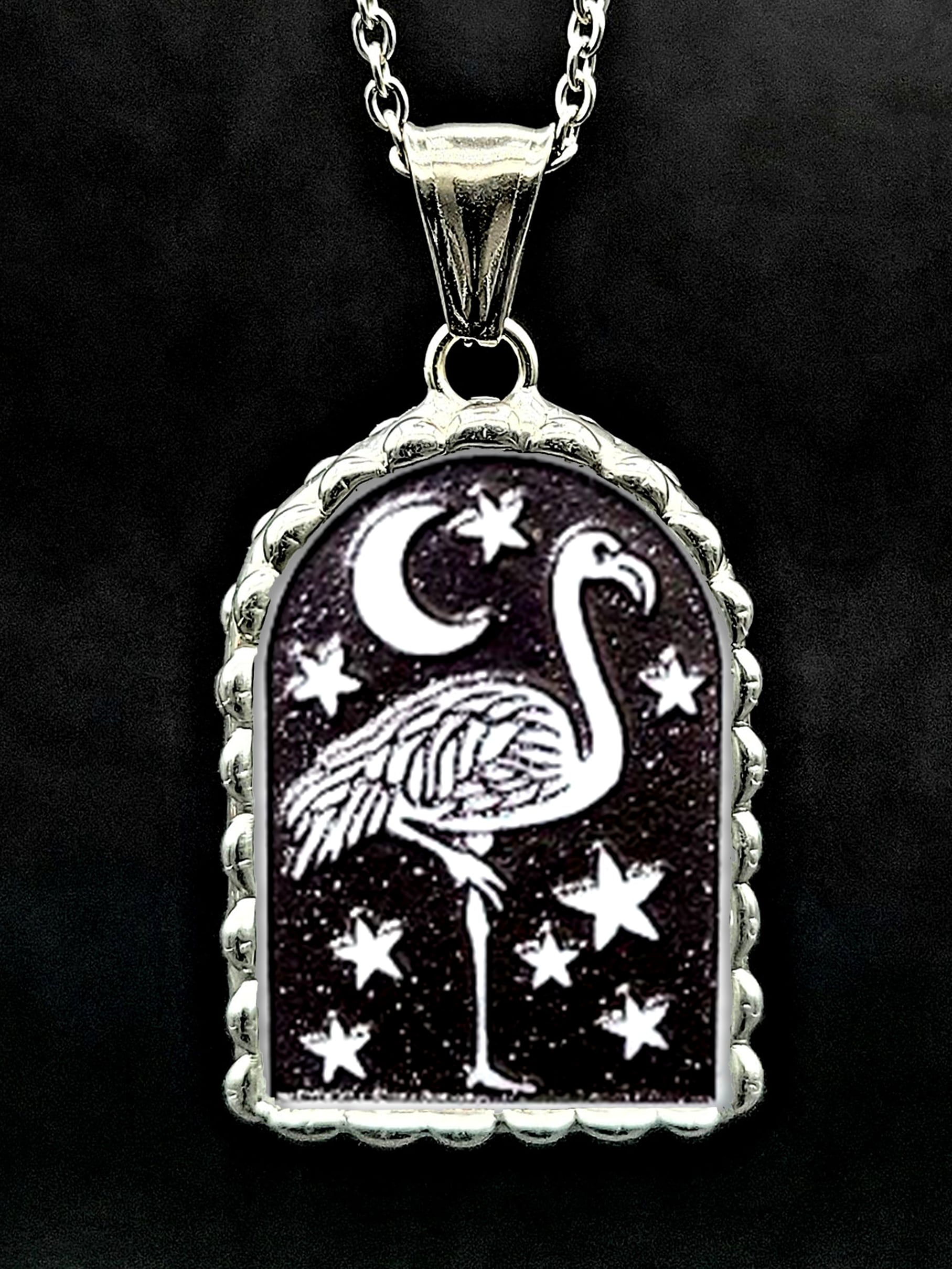 【検索用タグ】 フラミンゴ, 紅鶴, Flamingo, Phoenicopterus, 鳥類, 水鳥, 群れ, 湿地, ピンク, 羽, 賢い, 目, 夜景, 星, 三日月, 窓, ネックレス, ペンダント, 白, ホワイト, 黒, ブラック, B&W, ガラス, クリア, シルバー, 銀, 一点物, ハンドメイド, ギフト, 贈り物, お祝い, プレゼント, 幻想, ファンタジー, シュール, 作家:若林真耶(マヤズワークス、mayasworks)