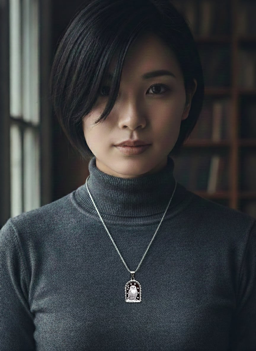 【検索用タグ】 シロフクロウ, Snowy Owl, Bubo scandiacus, 鳥類, 猛禽類, フクロウ, 森の賢者, 夜行性, 北極, 雪, ヘドウィグ, ハリーポッター, 夜景, 星, 三日月, 窓, ネックレス, ペンダント, 白, ホワイト, 黒, ブラック, B&W, モノクロ, ガラス, クリア, シルバー, 銀, 一点物, ハンドメイド, ギフト, 贈り物, お祝い, プレゼント, 幻想, ファンタジー, シュール, 作家:若林真耶(マヤズワークス、mayasworks)