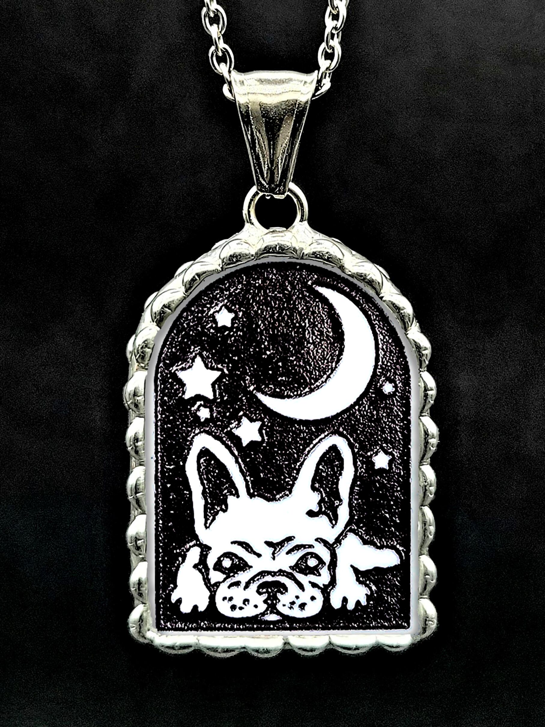 【検索用タグ】 フレンチブルドッグ, フレブル, フレンチー, Frenchie, ブヒ, Buhi, French Bulldog, フレンチ, 犬, 愛犬, ペット, 鼻ぺちゃ, ブサカワ, ユーモラス, コミカル, コウモリ耳, バットイヤー, いびき, 家族, 癒やし, 散歩, 夜景, 星, 月, 窓, ネックレス, ペンダント, フォーン, ブリンドル, パイド, クリーム, 白, ホワイト, 黒, ブラック, B&W, モノクロ, ガラス, クリア, シルバー, 銀, 一点物, ハンドメイド, ギフト, 贈り物, お祝い, プレゼント, 幻想, ファンタジー, シュール, 作家:若林真耶(マヤズワークス、mayasworks)
