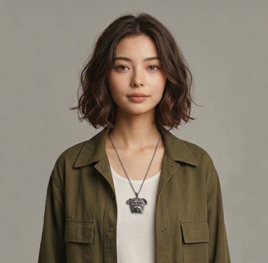 イングリッシュブルドッグ特有の豊かなシワや、愛嬌のある表情をそのまま閉じ込めた遊び心溢れる作品です。