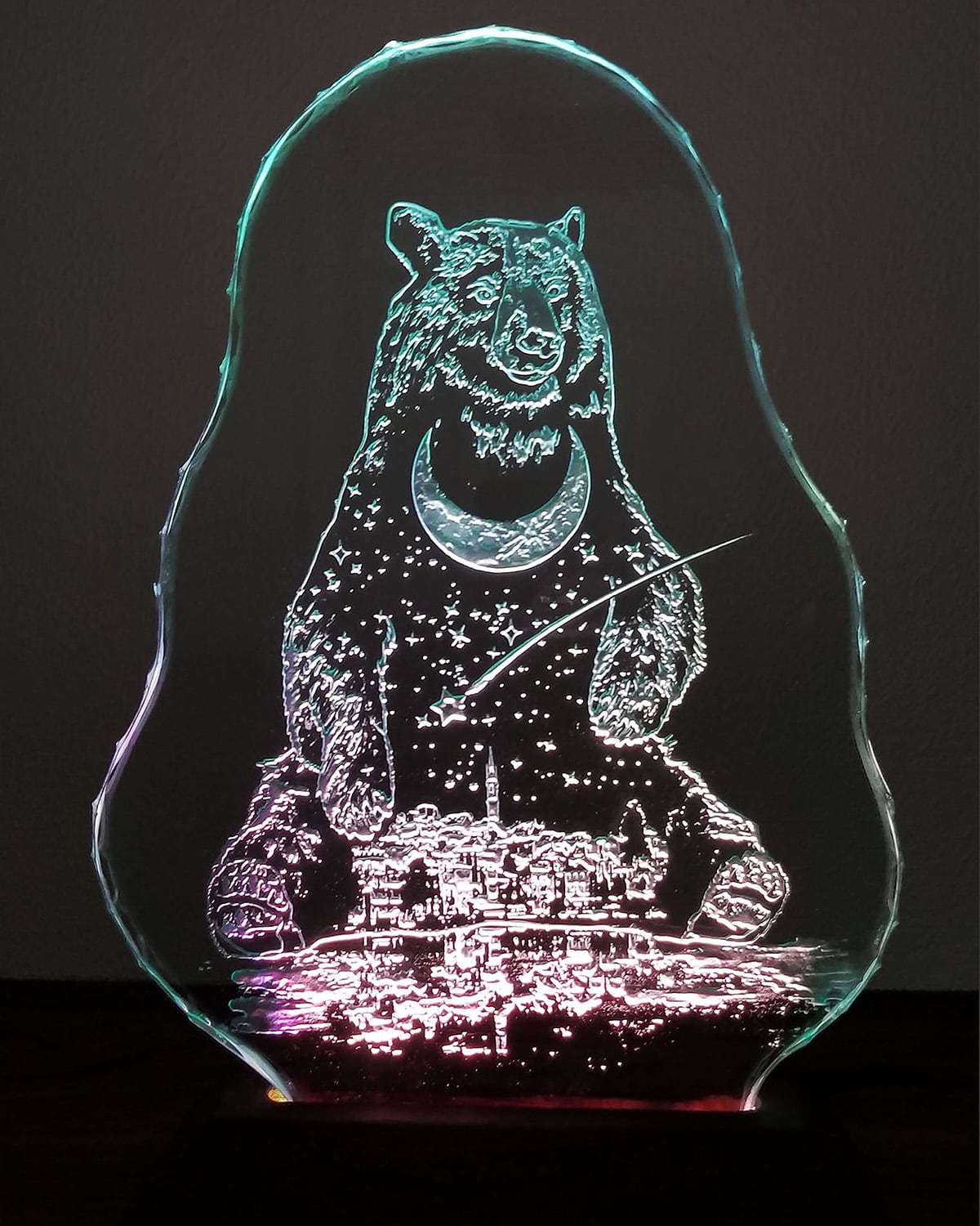 【検索用タグ】 マヤズワークス, mayasworks, 若林真耶, スカルプトリウム, Sculptorium, ツキノワグマ, クマ, 熊, bear, 星降る夜, 星, 夜景, 動物, アニマル, animal, ガラスアート, エッチング, ライト, 照明, ランプ, ギフト, プレゼント, 新築祝い, 結婚祝い, 誕生日, birthday, anniversary, wedding, gift, present, lamp, night, glass, etched
